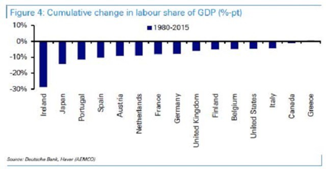 Однако дезинфляционное движение будет таким же. На уровне развитых стран нет сомнений в том, что за несколько десятилетий доля рабочей силы от ВВП снизилась. На рисунке 4 показано это снижение в отношении стран G20 с 1980 г.
