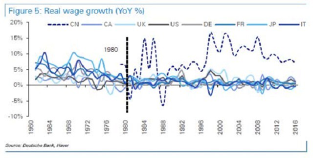 Кроме того, на рисунке 5 показан реальный рост заработной платы за последние несколько десятилетий при рассмотрении крупнейших стран мира. Как видно из данных за два десятилетия, у нас есть данные до 1980 г., реальный рост заработной платы был намного выше, чем в период после 1980-х гг.
