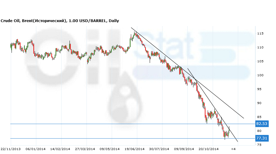 Поддержка — 77.31. Сопротивление – 82.53.Сценарий роста: каждый небольшой всплеск потенциально может перерасти в серьезное движение, но говорить о смене тенденции можно будет лишь при подъеме цен выше уровня 85.00. Рост до 85.00 выглядит вполне вероятным, однако попытки входа лучше делать при росте цен выше 80.00.