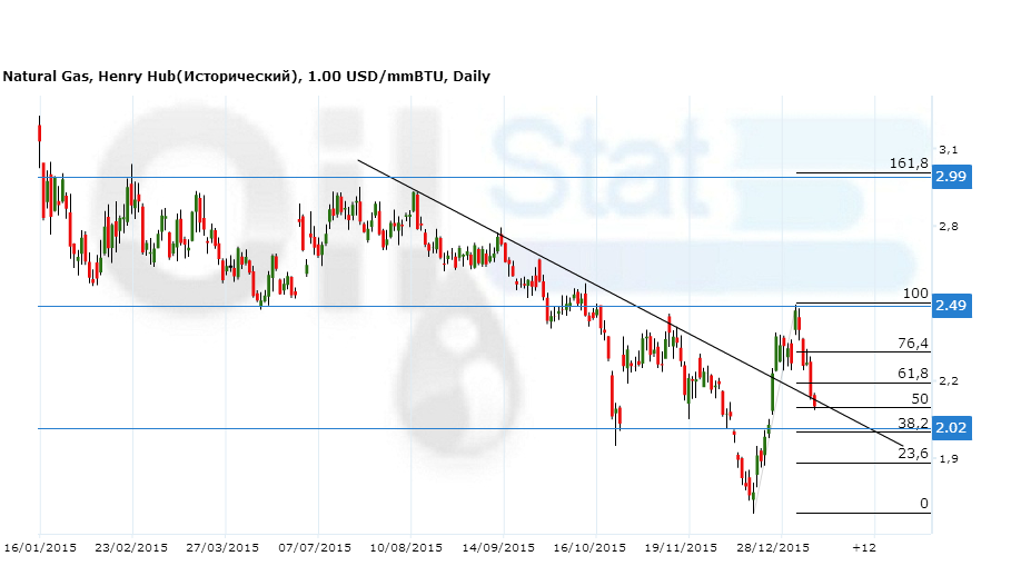 Сценарий падения:мы ожидали сопротивления от 2.60, все началось несколько ниже, что не дает преимущества быкам. Импульс не смог сходу преодолеть важный уровень сопротивления на 2.50, хотя шансы для этого были. Теперь из-за столь резкого отката рынок в перепроданности. Адептам медвежьей идеи нужен рост хотя бы к 2.30 чтобы совершить акт продажи, но лучше воздержаться, все же цены низки.