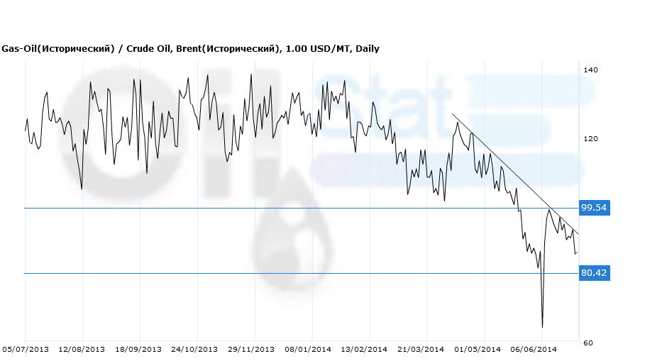 Сценарий роста: цены не смогли пробиться через линию сопротивления, и этот факт не добавляет быкам баллов. Покупать здесь крайне неудобно, нужен или уход цен выше 100.00, или уход выше линии сопротивления, или ход к более низким уровням, например 80.00.