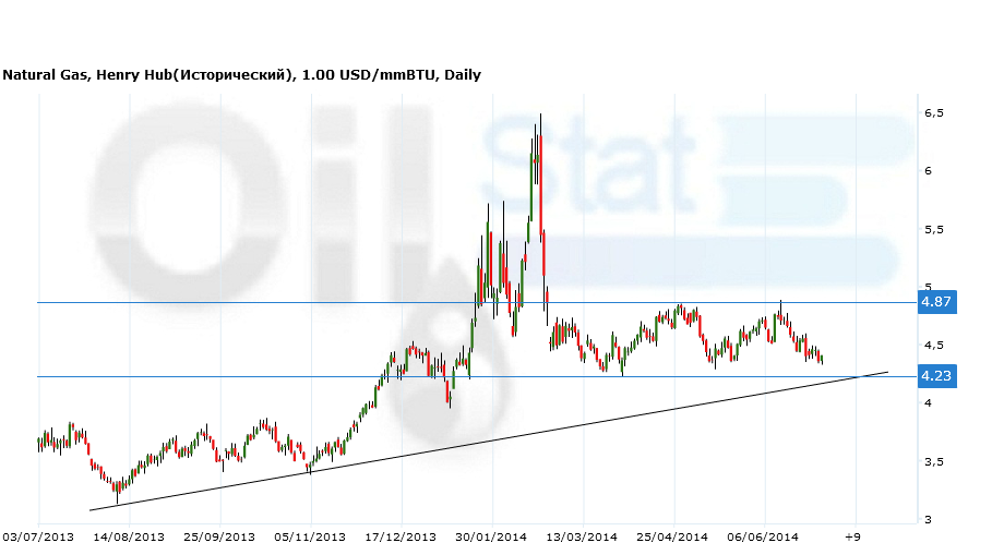 Сценарий роста: цены приближаются к уровню поддержки на 4.23. Прогнозировать резкий отскок дело неблагодарное, но и не обратить внимание на возможность откупа спекулянтами контрактов от обозначенного уровня мы не можем. При приближении к 4.23 – покупаем.