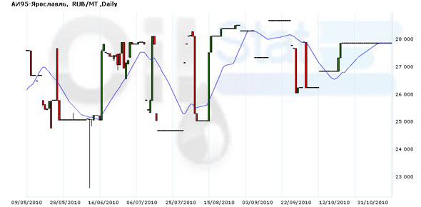 Цены на бензины остаются стабильными. Согласно индексу «eOil» на базисе «Ярославль» стоимость АИ-95 составляет 27 838 руб. за тонну. Это значение не меняется уже почти месяц. Возможно, с приходом морозов число активных автомобилистов сократится, таким образом потребление бензинов немного упадет.