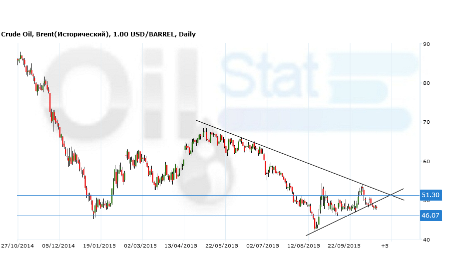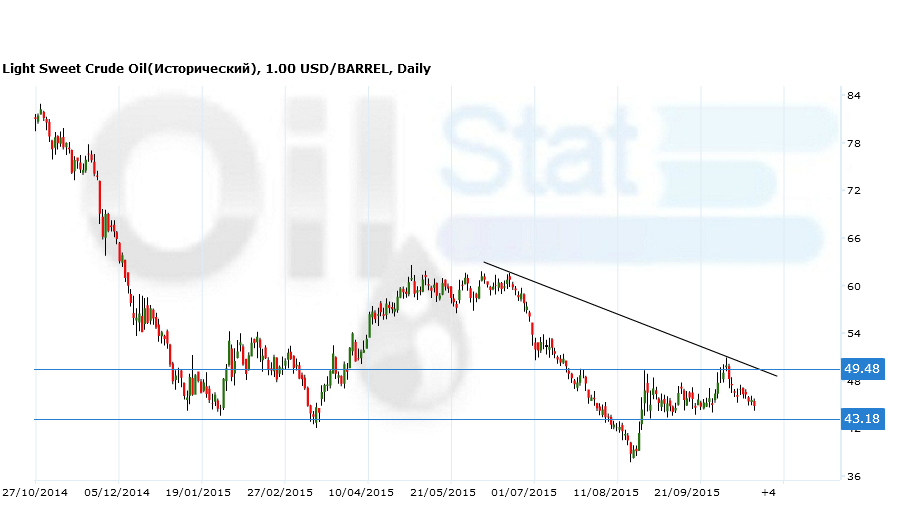 Сценарий падения:да, мы не рекомендовали новые продажи на прошлой неделе. И сейчас не будем. Нет хороших зеленых свечей, но нет длинных и красных. Пробой 43.00 вызовет ажиотаж, тем самым рынок уберет перепроизводство на рынке и в 17-м, а может и в 16-м году снова будет 80.