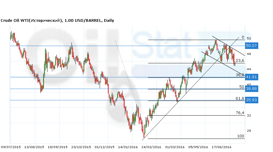 На Нью-Йоркской товарной бирже нефть WTI с поставкой в августе повысилась на 27 центов, или на 0,6%, до $45,41 за баррель, после падения в ходе сессии до $44,77, минимума с 11 мая.