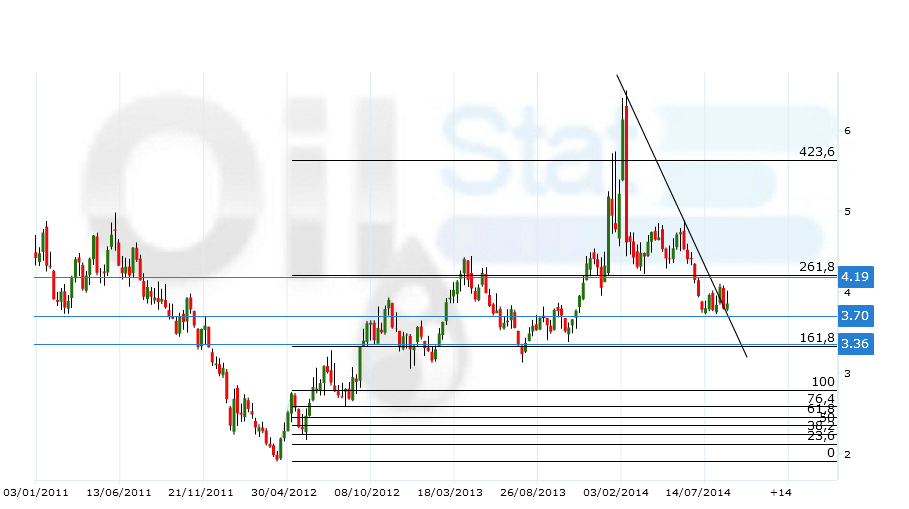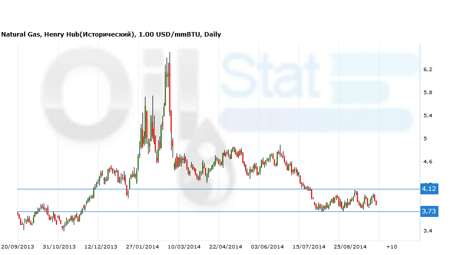 Сценарий роста: природный газ продолжает парить над уровнем 3.73, хотя ему ничего не мешает спуститься и к 3.36. Только подъем выше 4.12 может обозначить возрождение восходящей тенденции.