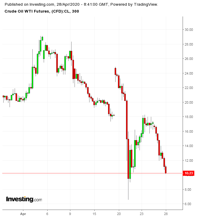 Вернемся к текущим событиям: июньский контракт (новый контракт следующего месяца) в понедельник вновь рухнул на ошеломительные 25% до $12,78 (хотя в долларовом выражении потери составили чуть более $4). Во второй половине азиатской торговой сессии июньский контракт упал еще на 14% (почти на $2) до минимума в $10,66.
