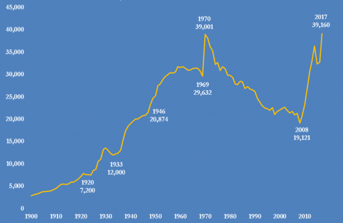 Рис. 1 Нефтяные резервы в США (1900 — 2017 годы), млн. баррелей
