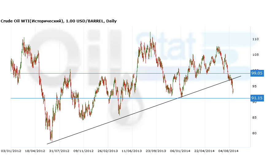 Сегодня черное золото продолжает незначительно дешеветь. На электронных торгах в Нью-Йорке по состоянию на 9:43 стоимость октябрьского контракта WTI снизилась на $0,12 -до $93,53 за баррель. Баррель нефти Brent в Лондоне стал дешевле на $0,15 и составил $102,14.