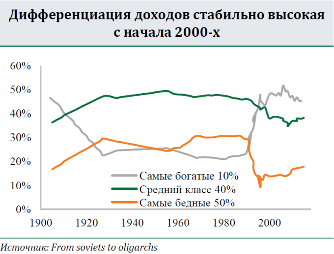Россия лидирует по темпам появления долларовых миллионеров. За 2016 год их число выросло на 19,7% и достигло максимума за историю рейтинга – 182 тыс. человек. Прошлый максимум был достигнут в докризисном 2013 году, но тогда «богачей» было гораздо меньше – 160 тыс. человек. В целом по миру, рост составил только 7,5%. Тем не менее, количество долларовых миллионеров в России относительно невысокое. Так, их число в США достигает 4,8 млн, Японии – 2,9 млн, в Германии – 1,3 млн. Но это отнюдь не объясняется равномерным распределением доходов. Согласно недавней статье Тома Пикетти (автор экономического бестселлера «Капитал в ХХI веке»), официальная статистика в России недооценивает неравенство доходов. По данным Росстата, на 20% самых богатых приходится 47% всех доходов. Однако в статье утверждается, что на только 10% самых богатых приходится уже около 45% всех доходов. В таком случае, по этому показателю мы находимся на одном уровне с США, но сильно «обгоняем» Францию (32%). Также дифференциация в России выше, чем в Китае и посткоммунистических странах Восточной Европы: Чехии, Венгрии и Польше. Резкий рост неравенства доходов произошёл в 90-е годы. Тогда доля богатых выросла с ~25% до ~45% и стабилизировалась на этом уровне. Увеличение произошло в основном за счёт бедных, чья доля снизилась с ~30% до ~ 15% (см. рис). В последние 10 лет дифференциация медленно уменьшается. Особенно заметно неравенство сократилось в последние годы, но это, по всей видимости, связано со снижением доходов богатых из-за кризиса, а не ростом доходов бедных.