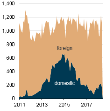 В течение первых шести месяцев 2018 года ценовой спред между Brent и WTI достиг среднего значения $5 за баррель, и нефтепереработчики Восточного побережья вновь начали закупать больше внутренней нефти. Однако, нынешние закупки все равно не сравнятся с объемами 2015 года.