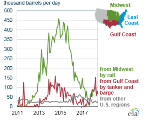 Начиная с середины 2017 года, на Восточное побережье США всё больше нефти из региона Gulf Coast поставляется на танкерах и баржах. Вместе с тем, поставки по железным дорогам из региона Midwest сокращаются.
