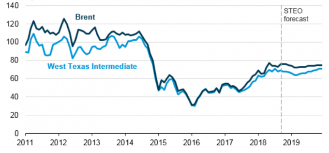 Согласно прогнозу Управления энергетической информации (EIA) “Short-Term Energy Outlook”, ценовой спред между Brent и WTI в 2018 и 2019 годах составит, в среднем, $6 за баррель.