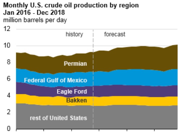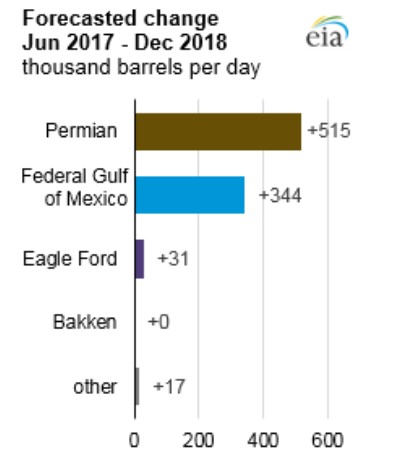 Управление энергетической информации прогнозирует, что большая часть роста объемов добычи нефти в США до конца 2018 года произойдет благодаря регионам Permian, Texas и Gulf of Mexico.