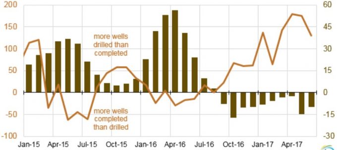 Тенденция операторов бурить больше скважин, но не осваивать их до конца, не имеет какой-то одной явной причины, но, судя по увеличению дисконта нефти WTI-Midland к WTI-Cuching, с начала 2017 года, эта тенденция может быть объяснена некоторыми имеющимися транспортными ограничениями. Отсрочка освоения скважин может также являться следствием применения стратегии, которая предполагает бурение максимального количества скважин с использованием одной буровой установки, прежде чем разворачивать оборудование для их освоения.