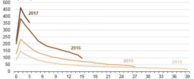 Показатель изначальной производительности на текущий момент выше, чем в 2016 году. Многие операторы продолжают экспериментировать с техниками освоения скважин, чтобы максимизировать показатель производительности на одну скважину. Соответственно, в 2017 году ожидается увеличение среднего изначального показателя производительности.