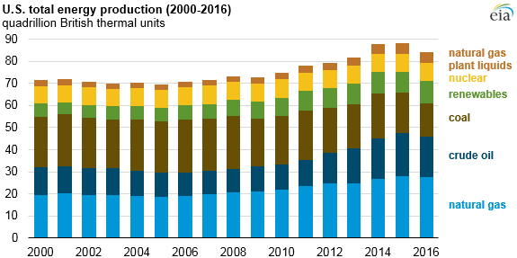 Производство первичной энергии в США в 2016 году составило 84,1 квадриллионов британских тепловых единиц (Btu), что на 4% ниже уровня 2015 года. Снижение производства совпало с увеличением общего импорта энергоресурсов и увеличением экспорта.