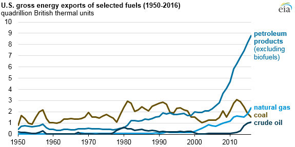 Рисунок 2: Экспорт валовой энергии США по видам топлива (1950-2016)