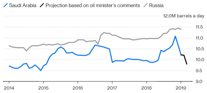 Действия России, мягко говоря, отличаются от шагов, предпринимаемых саудитами. Министр энергетики Александр Новак заявил, что сокращение нефтедобычи на 230,000 баррелей в день будет происходить постепенно в течение всей первой четверти года. В январе объемы нефтедобычи в России должны были оказаться на 50,000 — 60,000 баррелей в день меньше по сравнению с базовым октябрьским показателем. Но даже этой скромной цели добиться не удалось, так как по подсчетам агентства Bloomberg, производительность в России в январе была на 42,000 баррелей в день меньше октябрьских значений.