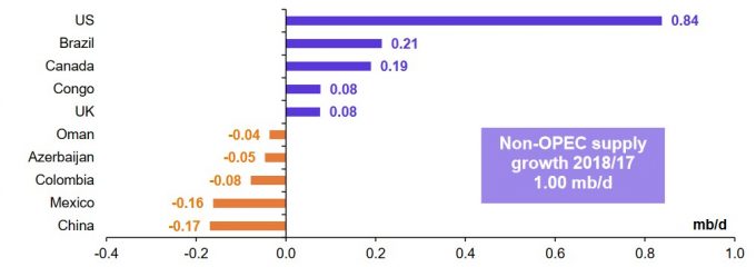 Рост показателей предложения среди стран, не входящих в ОПЕК, в 2018 году составит 1.00 mb/d. Общий показатель предложения среди стран, не входящих в ОПЕК, в 2018 году был пересмотрен в сторону понижения на 0.10 mb/d до 58.80 mb/d. Снижение показателя обусловлено, в основном, ослаблением прогнозов по объемам производства в России и в Казахстане в 2018 году.  В следующем году наибольший прирост производства произойдет в США, Бразилии, Канаде, Великобритании и Конго. Производство сократится в Китае, Мексике, Колумбии, Азербайджане и Омане.