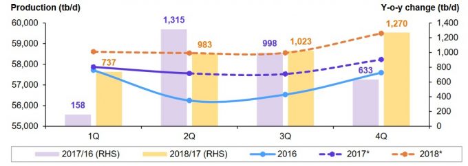Показатели предложения в России возрастут на 0.03 mb/d до 10.98 mb/d в 2017 году и ещё на 0.06 mb/d в 2018 году.