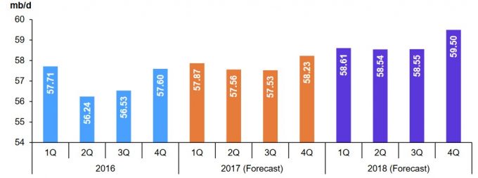Поквартальный прогноз показателя предложения в 2017 и 2018 годах свидетельствует об увеличении объемов добычи нефти, вызванном большей инвестиционной активностью. Тем не менее, прогноз показателей предложения среди стран, не входящих в ОПЕК, может ещё существенно измениться.