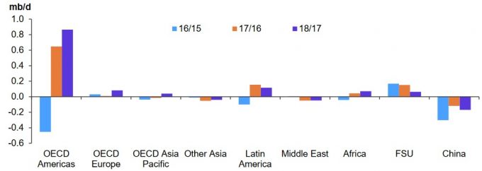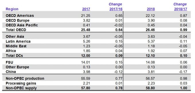 Рост показателей предложения во всех странах, не входящих в ОПЕК, за исключением Китая и стран Ближнего Востока, продолжится в следующем году. Лидерами по росту показателей предложения станут регионы OECD Americas с 0.87 mb/d, Латинская Америка с 0.11 mb/d, OECD Europe с 0.08 mb/d, Африка с 0.07 mb/d, страны бывшего СССР с 0.06 mb/d и OECD Asia Pacific с 0.04 mb/d. В 2018 году показатели снизятся в Китае, на Ближнем Востоке и в остальной Азии на 0.17 mb/d, 0.05 mb/d и 0.04 mb/d соответственно.