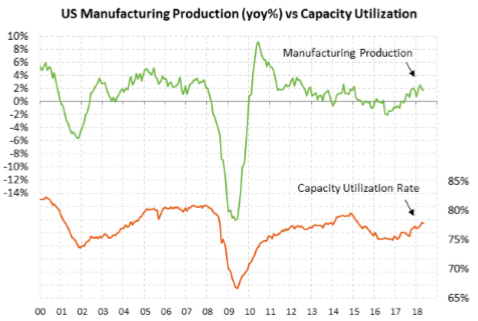 График 3. Промышленное производство США (процентное изменение год к году) против уровня использования производственного потенциала