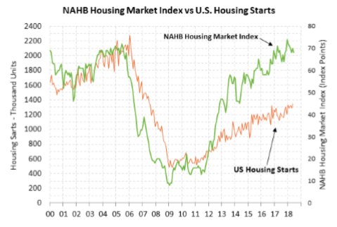График 4. Индекс рынка жилья в США от NAHB против количества строящихся жилых домов в США
