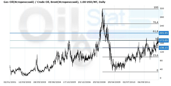 Взять к примеру для сравнения динамику европейского крэк-спреда Gas-oil против Brent – на графике мы не видим сопоставимого с американским крэк-спрэдом Heating Oil2/WTI пика, несмотря на схожую природу данных спрэдов.