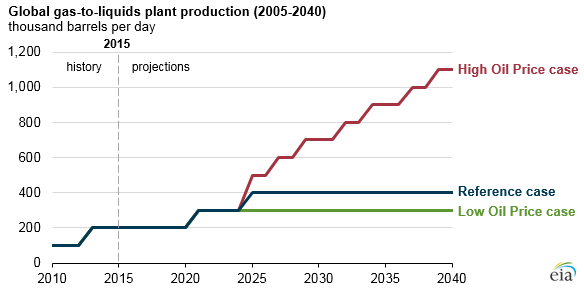 Согласно IEO2017, любые другие крупномасштабные заводы GTL не будут построены или расширены до 2040 года. Крупные заводы GTL являются капиталоемкими, а их экономика зависит от цены на сырую нефть относительно природного газа. В некоторых странах с предприятиями GTL отсутствуют внутренние нефтяные ресурсы, но они имеют доступ к природному газу. Заводы GTL позволяют этим странам преобразовывать природный газ в нефтепродукты.