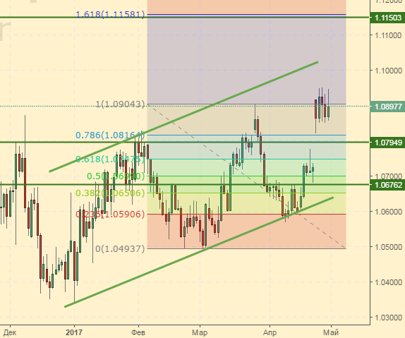 Евро не продаем. При спуске к 1.0760 до пятницы 5 мая – покупаем. Далее ждем результаты выборов.