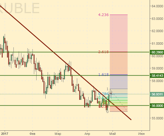 Хорошо будет смотреться откат к 56.20, где можно купить. Если нефть удержится выше 50.00, то он будет. Осторожно покупаем доллар. После того как взяли уровень сопротивления в районе 56.50 картинка по рублю медвежья, по доллару бычья.