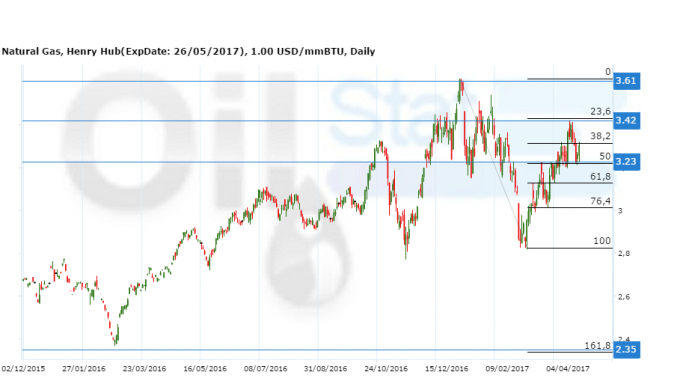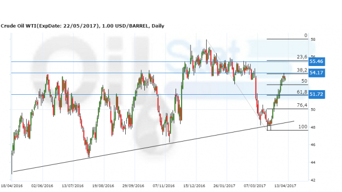 Сценарий роста: рассматриваем июньский фьючерс с датой экспирации 22 мая. Кто вошел в покупку выше 53.70 выходите из нее. Просто кройте позицию и все. Это не то, что хотелось бы увидеть. Резкого аномального прорыва вверх не произошло. Свеча среды, после выхода отчета EIA, носит явно медвежий характер. Для быков не будет ничего интересного вплоть до 50.50, а может и ниже. Надо будет посмотреть на характер падения.