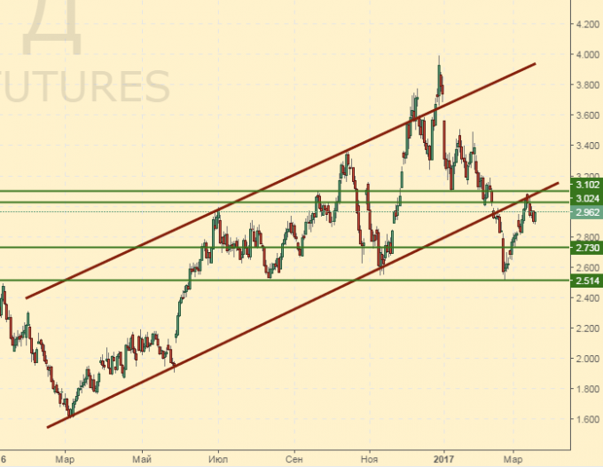 Сценарий падения: рекомендовали мы продажу с близким стоп-ордером на 3.04. Сбило ордерок. Если в течение недели вы входили снова, то вам плюс. Плюс на счет. Точка для продажи неделю назад была идеальной, такой она и останется в истории данного инструмента. События могут раскрутиться в район 2.20, а раз так, то постарайтесь встать в шорт при получении сигналов на часовых графиках.