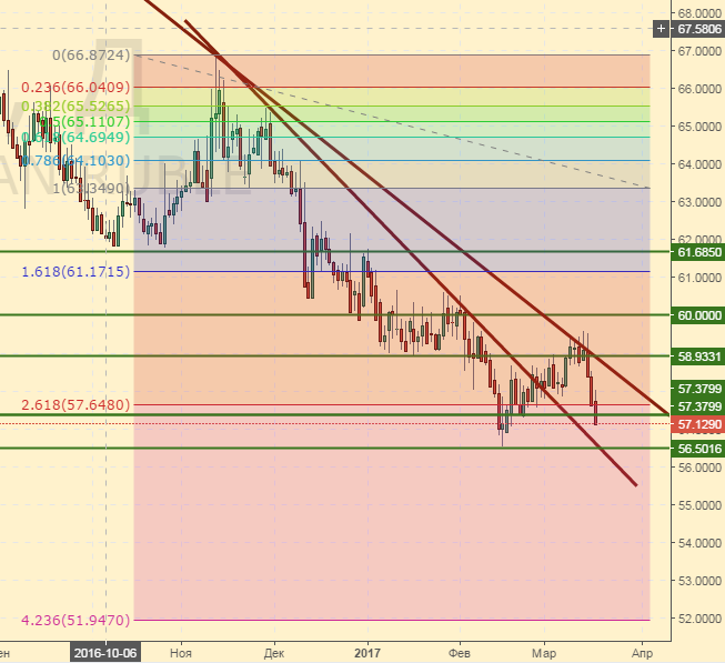 Сценарий роста: чуяло сердце, что надо стоп на 57.30 передвинуть. А мы ведь так и сделали. Стоп сбили. Пока о покупках забываем. На 56.50 возможна борьба, но теперь лучше не торопиться с выводами. 24 марта в 13.30 Мск узнаем решение нашего ЦБ по поводу ставки. Под 56.00 пустить не должны, хотя бы до озвучивания решения в пятницу. Однако, теперь после столь сильной обратной реакции, на повышение ставок в США с тремя красными свечами подряд, есть соблазн сбросить рынок до 52.00 и это может произойти, если ставка по рублю понижена не будет. Но стоит держать в уме, что игра в сильный рубль может закончится печально для экономики. Еще больше упадет пока все еще положительный платежный баланс, пострадают экспортеры, зато на моменте девочка сможет чуть доступнее купить себе новенький телефончик в розовом со стразиками, и на неделю человечек погрузиться в иллюзию маленького счастья. А, впрочем, мы все за стабильность, только бы нефть не подвела, правда?