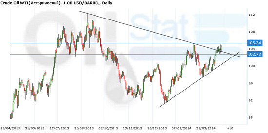 Сценарий роста: быки продолжают давить рынок вверх, но судя по длинным верхним теням свечей, и застою в одном районе им это не очень-то и удается. Преодолев сопротивление на 105.34, они вырвутся на простор, и вот тогда остановить их будет крайне тяжело. Ждем пробоя обозначенного уровня и тестирования его (касания) с обратной стороны – это и будет наиболее приемлемая точка для входа.