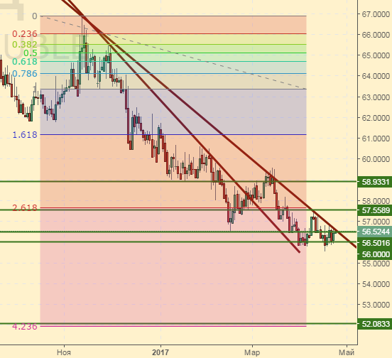 Продажа: при отсутствии падения на рынке нефти. Стоп близко, например, на 56.70. Кто в позиции, держит стоп на 57.07. Цель: 52.00.