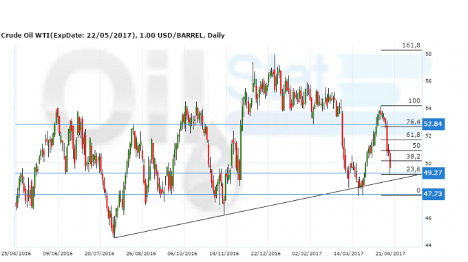 Сценарий падения: наше терпение увенчалось успехом. Он все-таки пролился вниз. Хорошо. Как и по Brent, закрываем 20% позиции, в случае роста к 51.50 продаем еще раз. Стоп-ордер пока оставляем на месте. Тот, кто все прозевал, тот надеется на рост рынка до 52.50 и только там продает.