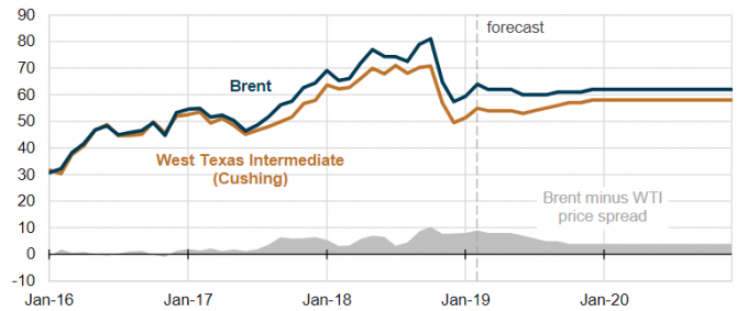 В мартовском прогнозе “Short-Term Energy Outlook” Управление энергетической информации указывает, что ценовой спред между Brent и WTI до июня 2019 года будет составлять, в среднем, $9 за баррель.