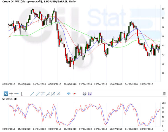 Стохастический индикатор направлен вверх, указывая на то, что в ближайшее время возможен подъем. Закрытия выше двадцатидневной скользящей $74,4 за баррель требуются для подтверждения того, что локальные минимумы достигнуты. Ближайшее сопротивление – высшее значение среды — $75,39 за баррель. Следующее сопротивление – пятидесятидневная скользящая средняя — $76,29 за баррель. Ближайшая поддержка — $72,63 за баррель. Следующая поддержка – низшее значение августа — $70,76 за баррель.