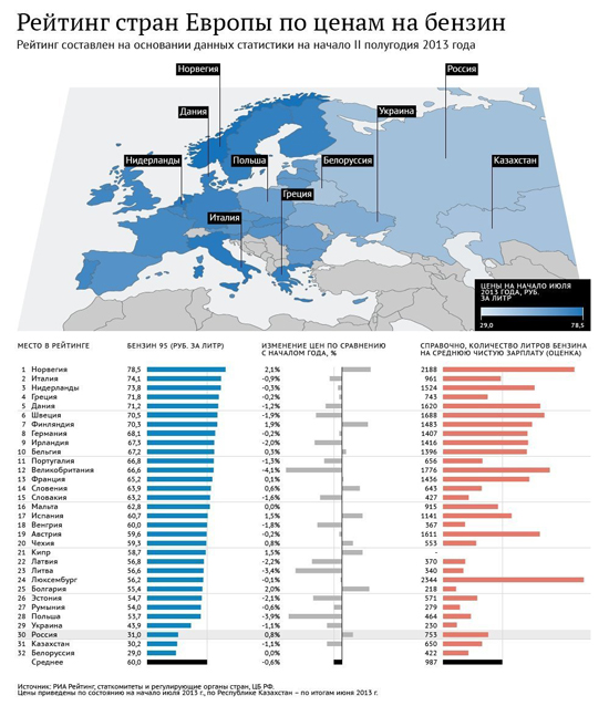 В I полугодии 2013 года стоимость бензина в странах Европы изменялась разнонаправленно, хотя ближе к середине года снижение цен на топливо вслед за падением нефтяных цен началось практически повсеместно.