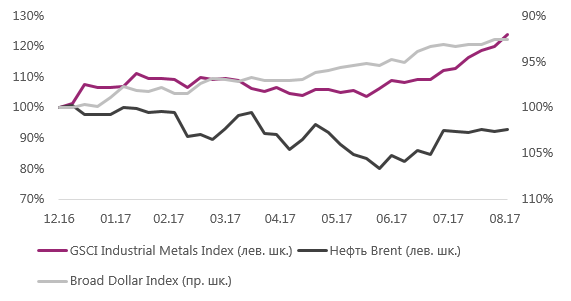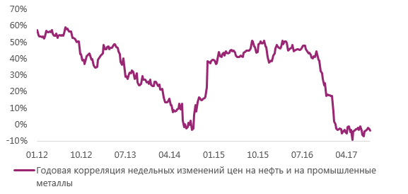 В январе–августе 2017 года индекс цен промышленных металлов вырос на 23,6%, тогда как цены на нефть упали на 7,2%. Это противоречит традиционному высокому уровню корреляции между ценами на нефть и промышленными металлами, который обусловлен общими для рынков этих сырьевых товаров движущими факторами (темпы роста мировой экономики в целом и развивающихся рынков в частности), а также схожей длительностью инвестиционных циклов. Периоды снижения корреляции нефти с промышленными металлами случались и ранее, но они были ограничены во времени и фундаментально обоснованы. Так, снижение корреляции в период с 2013 года по первую половину 2014 года было связано в первую очередь с геополитическими причинами: рост предложения нефти ограничивался последствиями конфликтов в Северной Африке и на Ближнем Востоке, а цены на нефть включали в себя существенную премию за риск.