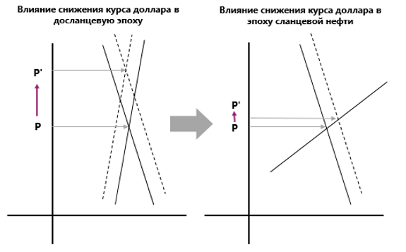 Рисунок 3. Влияние ослабления курса доллара на соотношение спроса и предложения на рынке нефти в досланцевую и сланцевую эпохи