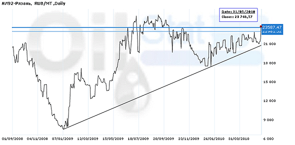 График демонстрирует, что рязанский бензин преодолел уровень сопротивления от 20.06 2009г. и стремится к летним максимумам прошлого года. Видно, что спрос на рязанский бензин достаточно высокий.