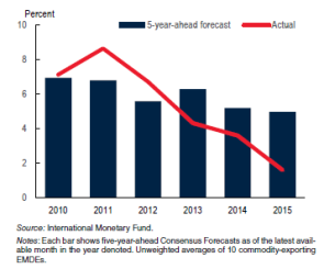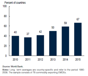 Рост инвестиций в экспорт сырьевых товаров в странах с формирующимся рынком и в развивающейся экономикой (EMDE) резко снизился, начиная с 2010 года и был ниже своего долгосрочного среднего значения у примерно двух третей этих стран в 2015 г. Такое снижение отражает слабые перспективы роста, повышенный уровень неопределенности, ухудшение условий торговли и рост частных задолженностей в числе других факторов. Политики сталкиваются с ослаблением налогово-бюджетной позиции и инфляцией выше целевого уровня инфляции.