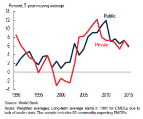 В развивающихся странах-экспортерах 78% от всех инвестиций составил частный сектор в 2010-2015 годах. Начиная с 2013 года государственные капиталовложения начали лететь вниз и совсем упали в 2015. С другой стороны, частные инвестиции более плавно снижались, начиная с 2010 года. Считается, что условия должны улучшиться в свете ожидаемого роста цен. Кроме того, вероятное улучшение налогово-бюджетного стимулирования в наиболее развитых индустриальных странах и возможный положительный ответ других экономик отражают риск повышения в глобальном прогнозе. Увеличение объемов производства в экспортирующих странах EDME замедлилось после финансового кризиса. В 2011 году показатель составил 8,9%, а в 2015 – всего 0,4%. До кризиса показатель составил 11,5% в среднем за 2003-2008 годы.