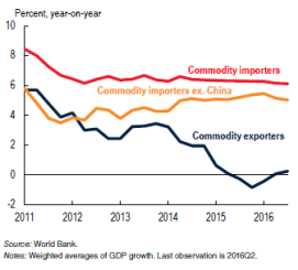 Несмотря на стабилизацию цен на сырье в течение 2016 года, в совокупности падение цен выразилось двузначной цифрой, вызвав глобальный шок относительно условий торговли. Некоторые страны продолжают борьбу и подстраиваются под низкие сырьевые цены. ВВП в экспортирующих странах вырос примерно на 0,3 процента в 2016 году. Это намного ниже, чем в импортирующих странах, где рост ВВП составил 5,6%.