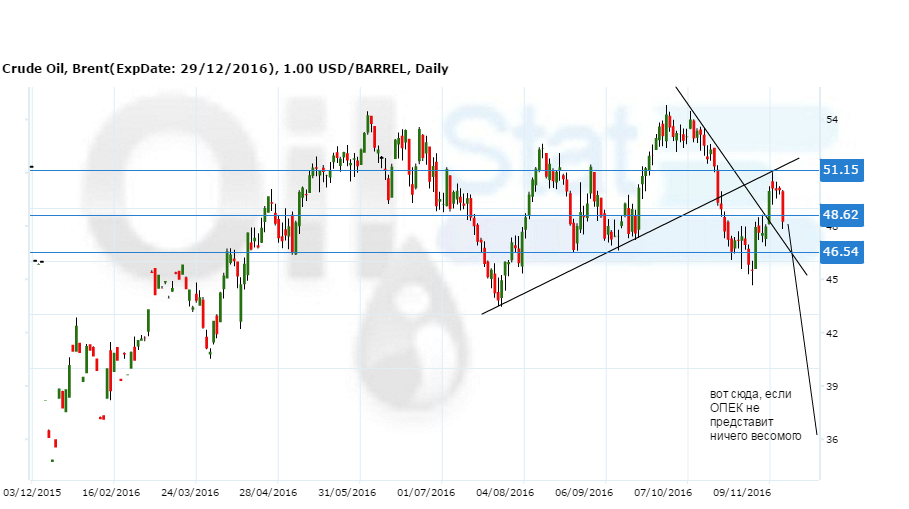 Фундамент: саммит ОПЕК в Вене 30-го ноября — удивите меня и договоритесь между собой, сильные мира сего. Пока есть вы, буду и я. 50 за бочку? Вам даже цена не важна. Думаете, никто не понимает, да? А как же интуитивный трейдинг. Вот он. Его прямое исполнение. Если бы я о вас как о людях думал, люди это те, кто сделан по образу и подобию Бога, кто забыл, я бы не рекомендовал шортить на прошлой неделе. ТОВАРИЩИ СПЕКУЛЯНТЫ, вверх по нефти может смотреть только тот, кто случайно посмотрел в данном направлении. Да прибудет с нами до кучи на таком милом фоне расконсервация вышек горизонтального бурения в регионе Баккен, что на севере США.