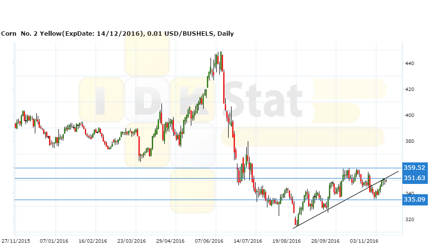 Сценарий падения: здесь надо продавать. Если открытие понедельника позволит, и цены будут близки к 350.00, продажи должны быть агрессивными с коротким стоп-ордером на 353.00.Квалифицированных спекулянтов-быков в этой точке не будет, мелочь сделать ничего не сможет, фундаментальной поддержки из-за большого урожая и ожидания повышения ставки ФРС в декабре – нет. Поэтому, мы не ждем роста цен.